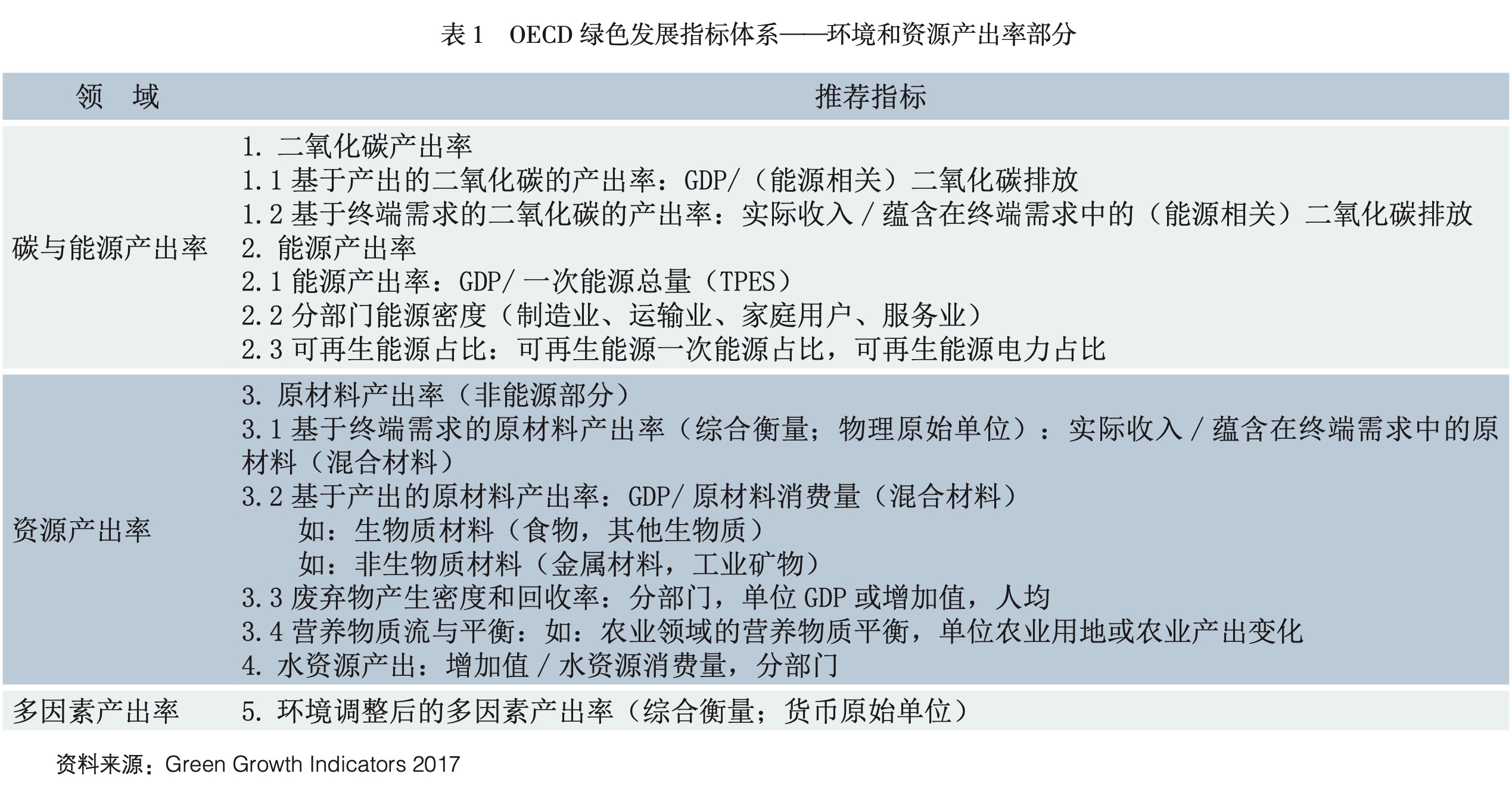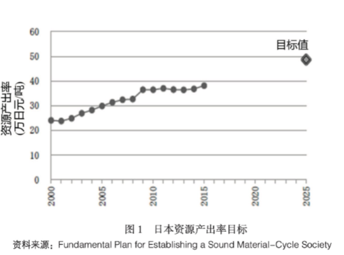 經(jīng)合組織(OECD)率先建立了“綠色發(fā)展指標體系”,其中第二部分即“經(jīng)濟的環(huán)境和資源產(chǎn)出率”指標,包括二氧化碳產(chǎn)出率、能源產(chǎn)出率、原材料產(chǎn)出率、水產(chǎn)出率和環(huán)境調(diào)整后的多因素產(chǎn)出率(即環(huán)境綜合產(chǎn)出率)(見表1)。在該指標體系的指導下,各國可結(jié)合各自實際制定相應的具體目標,以日本為例,其在《建立循環(huán)型社會基本法》中提出2025年資源產(chǎn)出率達到49萬日元/噸,比2015年提高11萬日元/噸的目標(見圖1)。