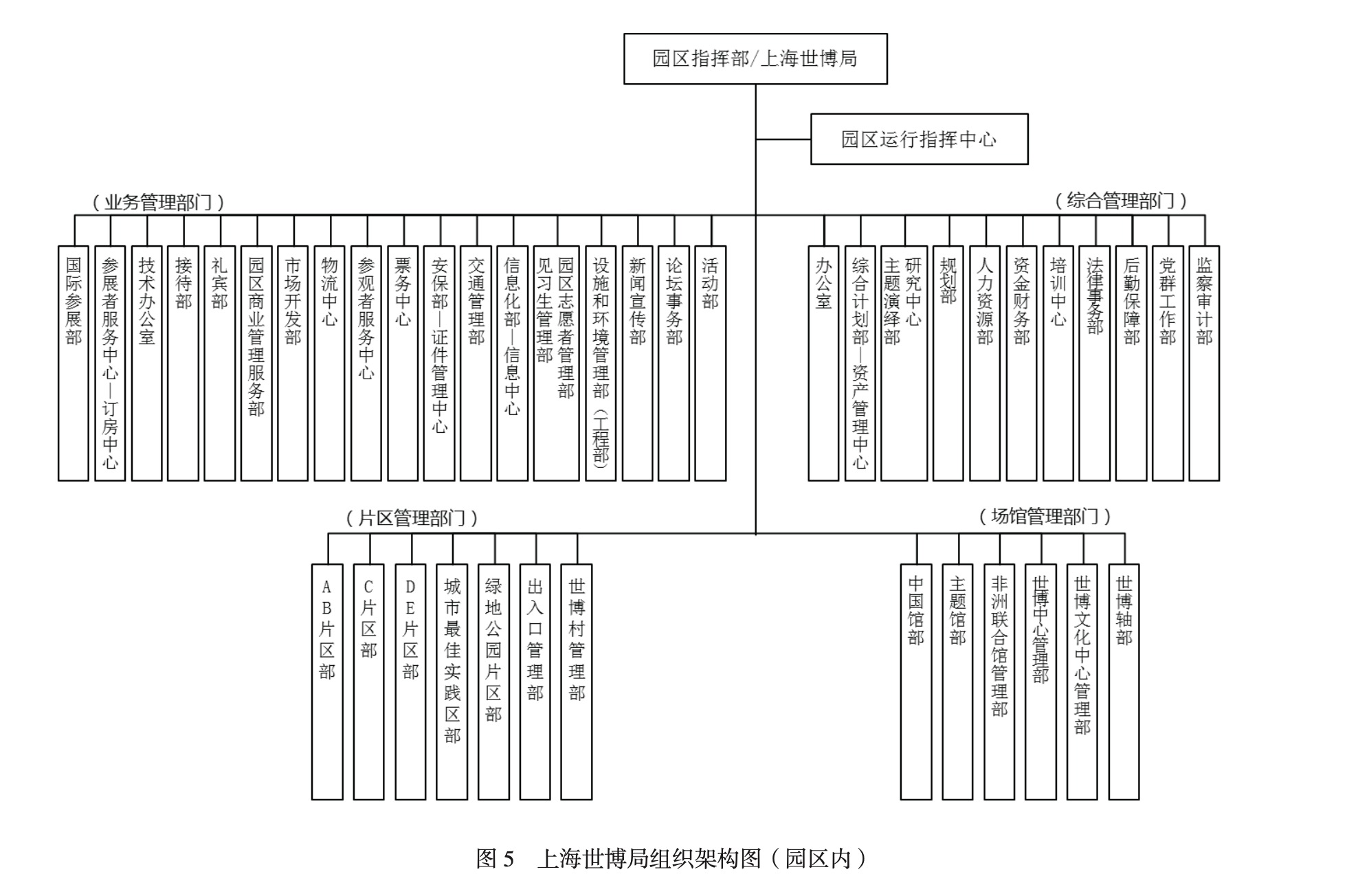 2009年,上海世博局調(diào)整職能,成立相應(yīng)的多個片區(qū)管理部,正式轉(zhuǎn)入運營架構(gòu);最終由43個部門構(gòu)成;