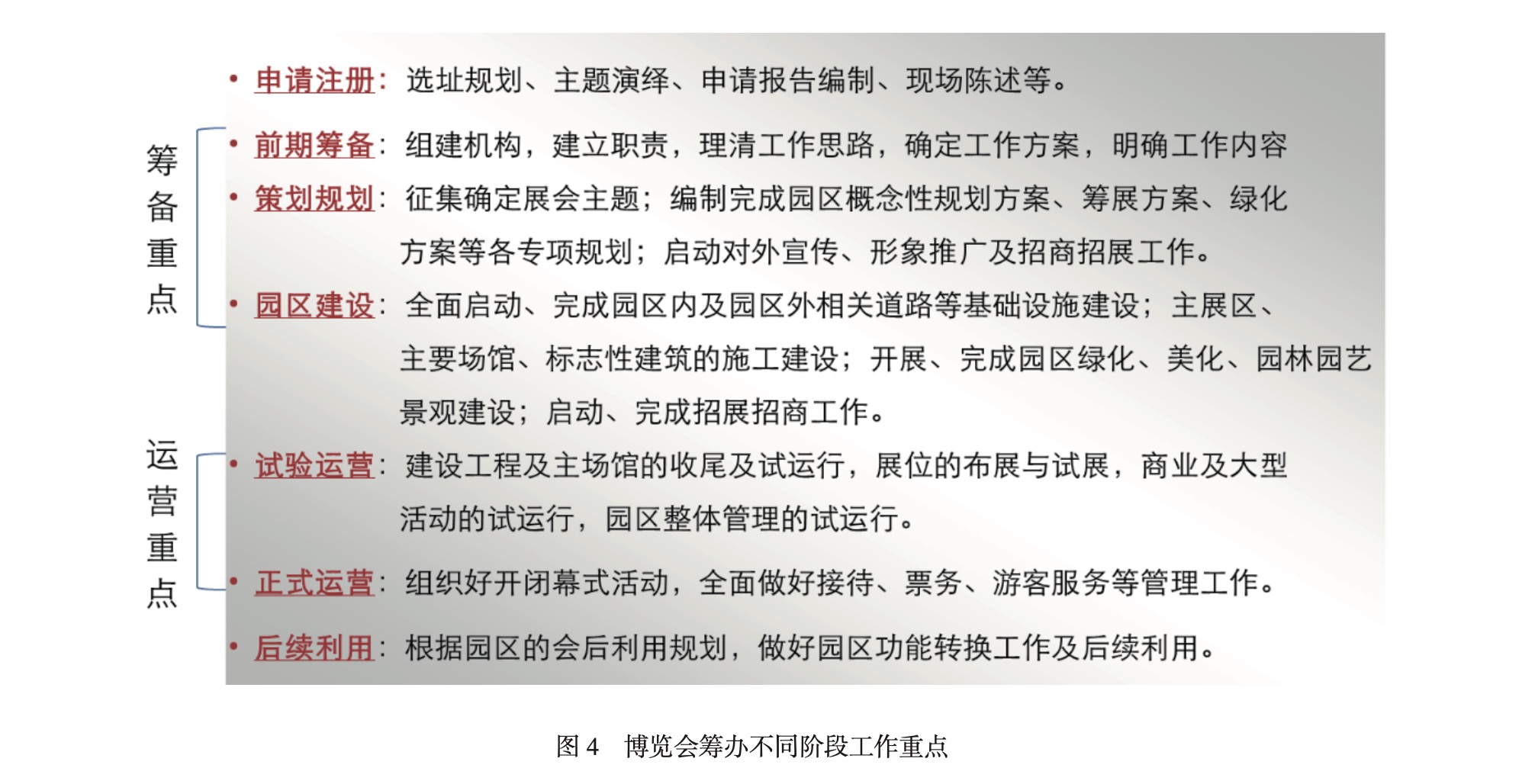 大型博覽會組織體系建設(shè)貫穿從申辦到籌備,到運營,再到后續(xù)利用全過程。(1)申辦階段:一般臨時組建申辦領(lǐng)導小組,具體由下屬某單位牽頭的申辦小組辦公室負責。(2)籌備階段:一般成立籌委會指揮部,具體由籌委會辦公室負責,尤其是園區(qū)相關(guān)籌備工作,同時建立相應(yīng)投資公司負責投融資和后續(xù)運營管理;組委會和執(zhí)委會層級不同,成立先后也略有差異。(3)運營階段:一般成立園內(nèi)外兩級運營指揮體系,且多數(shù)由原來的架構(gòu)體系職能演變而來。(4)后續(xù)階段:一般由起初成立的公司或牽頭單位負責后續(xù)開發(fā)和運營管理。