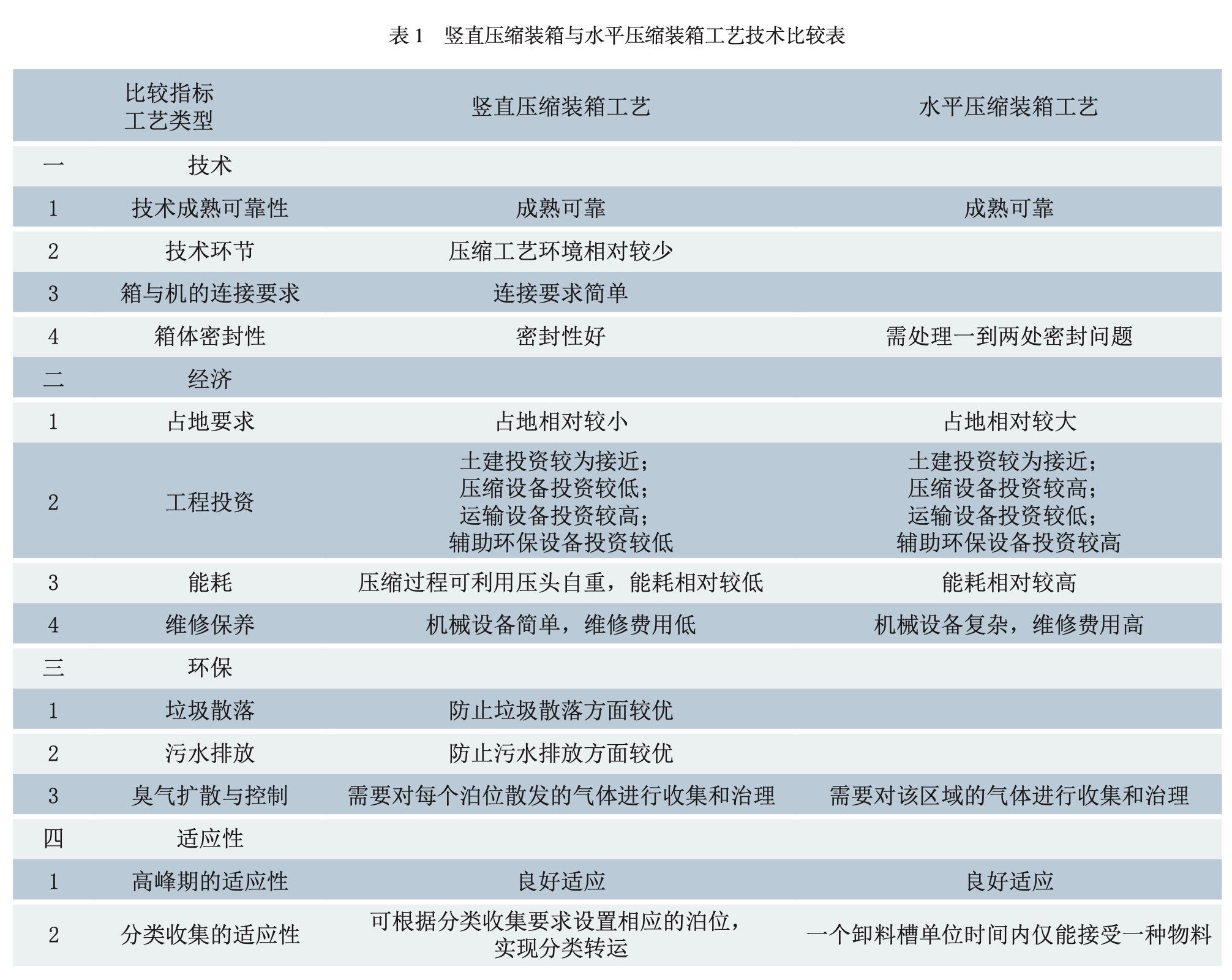因此,新建垃圾轉(zhuǎn)運(yùn)站應(yīng)優(yōu)先考慮采用垂直壓縮裝箱工藝,有利于實(shí)現(xiàn)垃圾分類轉(zhuǎn)運(yùn)、節(jié)約土地、能耗和維修成本,有效控制環(huán)境污染。此外,由于市區(qū)內(nèi)已建設(shè)的垃圾轉(zhuǎn)運(yùn)站以豎直壓縮裝箱工藝為主,采用同樣的工藝,相應(yīng)運(yùn)輸設(shè)備具有互換性,便于運(yùn)營過程中的協(xié)調(diào)管理。