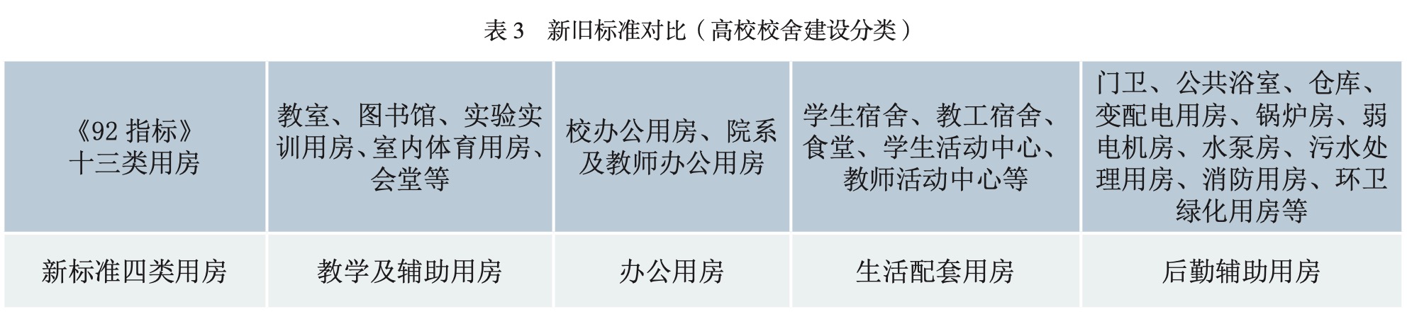 《92指標(biāo)》規(guī)定了高校必備的十三項校舍指標(biāo)。但隨著高校教學(xué)實踐的不斷發(fā)展,部分指標(biāo)已與實際需求脫節(jié)。一是隨著數(shù)字模擬、虛擬仿真等現(xiàn)代教學(xué)技術(shù)手段的運用,教學(xué)與實驗實訓(xùn)共用校舍的情況越來越普遍,很難明確區(qū)分。二是在實際建設(shè)使用中高校將體育場館與會堂功能結(jié)合設(shè)置的情況越來越多,也很難分開。三是按照后續(xù)教育部發(fā)布的學(xué)生公寓標(biāo)準(zhǔn),《92指標(biāo)》中的相關(guān)指標(biāo)也已失效。四是教工住宅指標(biāo)實際上已廢止不用。五是生活福利及其他附屬用房中的幼兒園、托兒所、招待所、印刷所等用房均已實現(xiàn)社會化,相關(guān)指標(biāo)無法使用,但同時各類設(shè)備用房需求反而增加較多,《92指標(biāo)》規(guī)定的變電所和水泵房內(nèi)容已無法全部覆蓋。