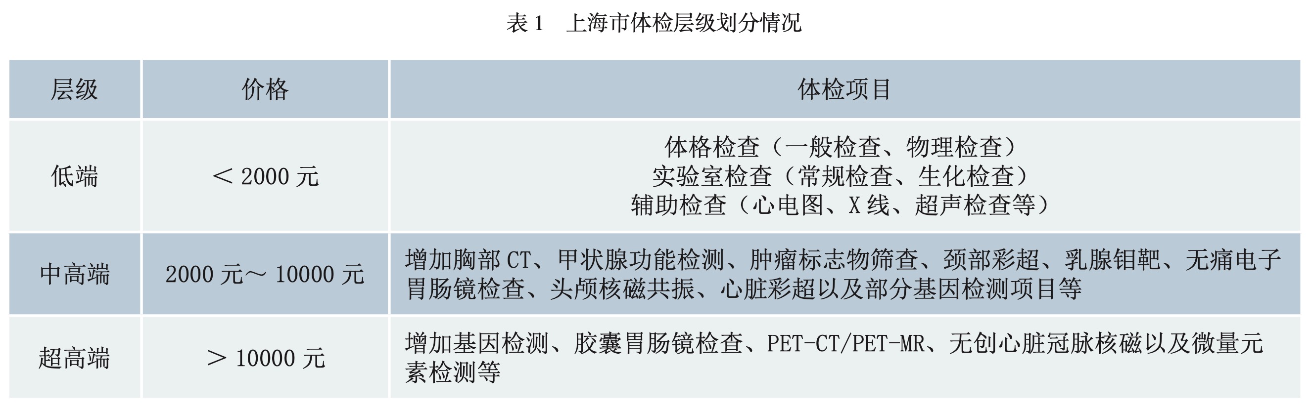 綜合對(duì)上海東郊國(guó)際體檢中心、上海華醫(yī)淀山湖療養(yǎng)院、全景醫(yī)學(xué)影像、美兆健康醫(yī)療、愛康國(guó)賓等機(jī)構(gòu)的調(diào)研情況,根據(jù)體檢價(jià)格和體檢項(xiàng)目的差異,可將上海地區(qū)的體檢套餐劃分為三個(gè)層級(jí),即超高端體檢、中高端體檢和低端體檢。中高端體檢通常包含了肺部CT、MR、彩超、腫瘤標(biāo)志物篩查等檢查內(nèi)容。隨著體檢層次的提升,個(gè)性化選項(xiàng)也不斷增加,詳見表1。