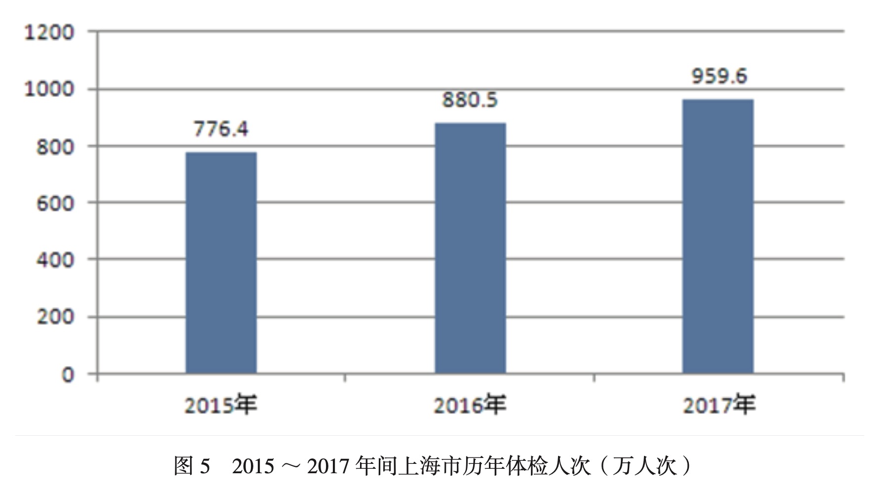近年來(lái),上海健康體檢行業(yè)的發(fā)展也呈快速增長(zhǎng)態(tài)勢(shì)。根據(jù)國(guó)家統(tǒng)計(jì)局相關(guān)數(shù)據(jù),2015~2017年間,上海地區(qū)體檢人次復(fù)合增長(zhǎng)率約為11.2%,2017年上海地區(qū)體檢人次高達(dá)959.6萬(wàn),詳見圖5。