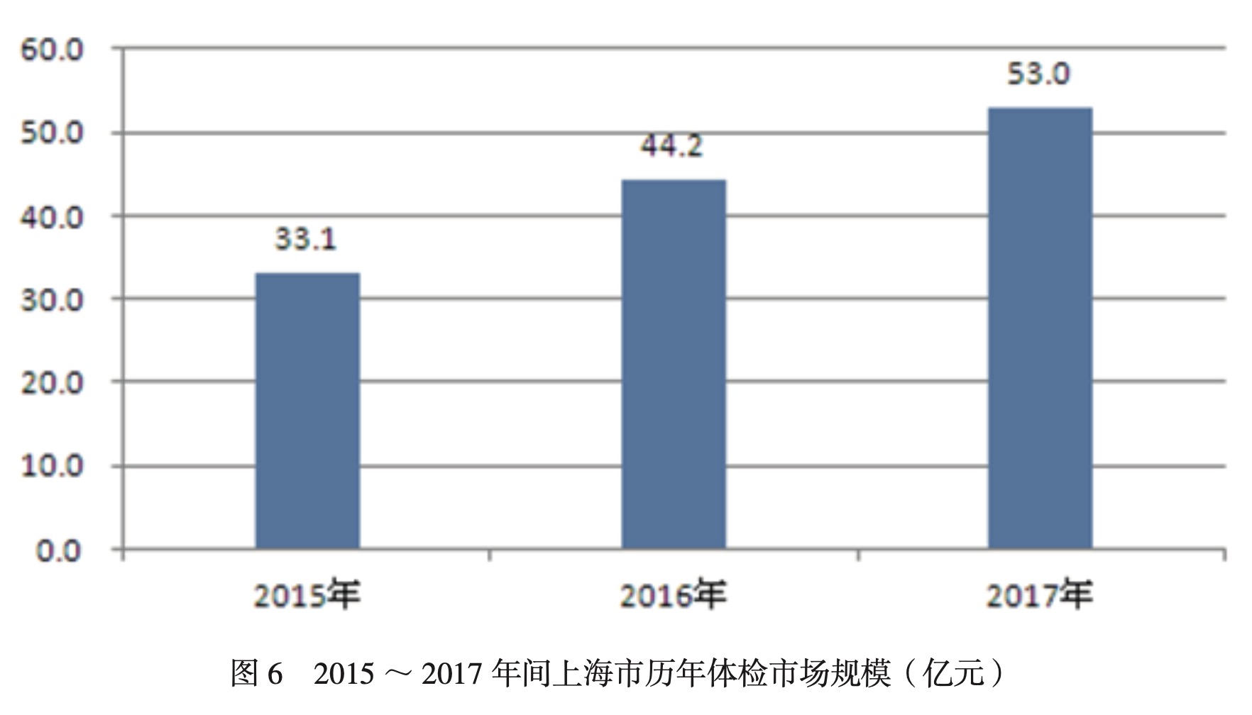 根據(jù)融信健康統(tǒng)計(jì)的上海地區(qū)體檢客單均價(jià)進(jìn)行擬合計(jì)算,2015~2017年間,上海地區(qū)體檢市場(chǎng)規(guī)模的復(fù)合增長(zhǎng)率約為26.5%左右,2017年上海地區(qū)體檢市場(chǎng)規(guī)模高達(dá)53億元,詳見圖6。