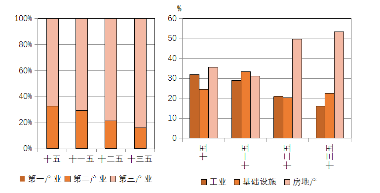 (二)服務(wù)業(yè)唱主角,三大領(lǐng)域動(dòng)態(tài)調(diào)整。從三次產(chǎn)業(yè)投資結(jié)構(gòu)看,全市固定資產(chǎn)投資繼續(xù)向第三產(chǎn)業(yè)傾斜,“三、二、一”特征更加明顯,第三產(chǎn)業(yè)占比從“十二五”78.8%提高到“十三五”83.9%,金融和房地產(chǎn),批零、運(yùn)輸倉儲(chǔ)和交通等服務(wù)業(yè)貢獻(xiàn)較大。分領(lǐng)域看,工業(yè)固定資產(chǎn)投資占比持續(xù)走低,從“十二五”20.9%下降到“十三五”16.0%;基礎(chǔ)設(shè)施重拾韌性,“十三五”占比回升至22.6%,市政與交通成為重要增長點(diǎn);房地產(chǎn)保持高位占比約53.4%,結(jié)構(gòu)有所分化。