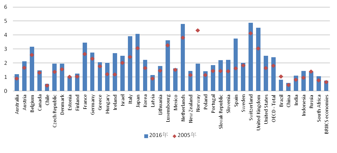 在經(jīng)合組織(OECD)對(duì)資源產(chǎn)出率的研究中,將資源分為生物質(zhì)(食物和飼料、木材)、化石能源、非金屬礦物(建筑材料、其他非金屬礦物)、金屬及金屬礦物四大類(lèi)。研究結(jié)果顯示,2005至2016年,大部分國(guó)家的資源產(chǎn)出率均有所增長(zhǎng);金磚國(guó)家的資源產(chǎn)出率與OECD國(guó)家相比仍有較大差距(見(jiàn)圖2)。