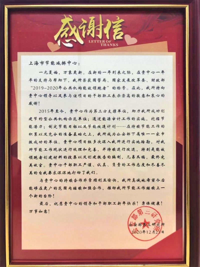 近日,公安部第三研究所陸曙蓉副主任帶隊赴上咨節(jié)能減排中心(以下簡稱中心)贈送“優(yōu)質服務、助力發(fā)展”錦旗和表揚信,感謝中心在全面服務公安部第三研究所爭創(chuàng)“國管局、國家發(fā)展改革委、財政部2019-2020年公共機構能效領跑者榮譽稱號”工作中展現出的高水平業(yè)務能力和全方位服務意識。