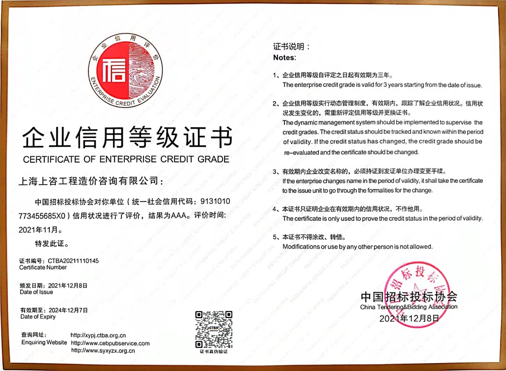 近日,上咨集團(tuán)所屬上海上咨工程造價(jià)咨詢有限公司(以下簡稱上咨造價(jià))榮獲由中國招標(biāo)投標(biāo)協(xié)會(huì)頒發(fā)的企業(yè)信用評(píng)價(jià)AAA級(jí)證書(該信用評(píng)價(jià)等級(jí)為最高等級(jí))。