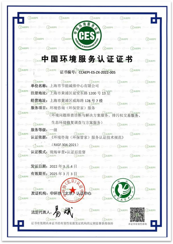 2022年3月4日,上咨集團所屬上海市節(jié)能減排中心(以下簡稱“節(jié)能減排中心”)順利通過CES環(huán)境服務資質(zhì)認證,獲得環(huán)境咨詢(環(huán)保管家)服務一級資質(zhì)證書。該認證為全國性環(huán)境服務認證 ,目前全國持證企業(yè)約56家,上海市持證企業(yè)僅7家。