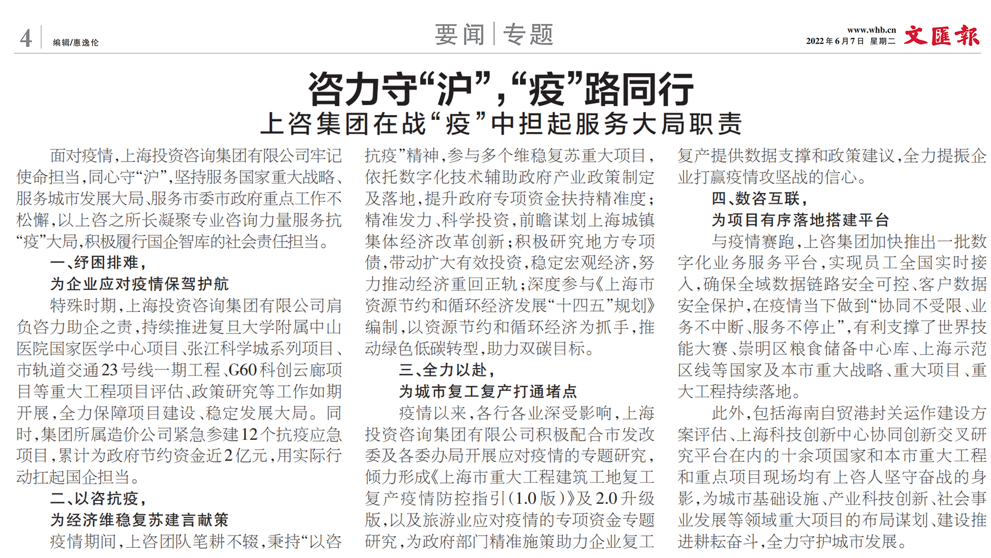 2022年6月7日,文匯報刊登《咨力守“滬”,“疫”路同行——上咨集團在戰(zhàn)“疫”中擔(dān)起服務(wù)大局職責(zé)》一文,專題報道上咨集團以咨詢力量服務(wù)抗“疫”大局,積極履行國企智庫的社會責(zé)任擔(dān)當。